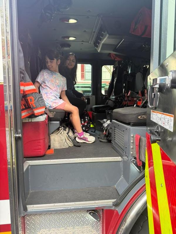 | Earlier this week Engine 141s crew picked up a student from home and dropped her off at Mooreland Elementary School. The student was a winner for the school districts yearly Buck a Book event, which is a fundraiser for the Employment Skills Center. The Company is happy to support this event every year! We hope you had a fun ride to school!